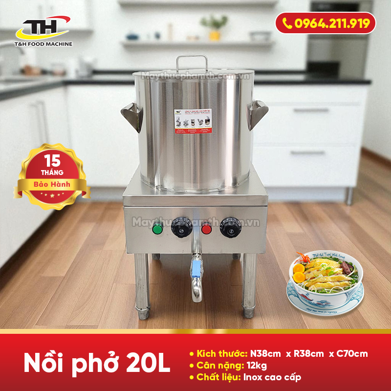 Vậy với nồi nấu phở 20L sẽ đáp ứng được khoảng 50 bát phở mỗi lần, đáp ứng tốt cho các quán bún phở quy mô nhỏ.