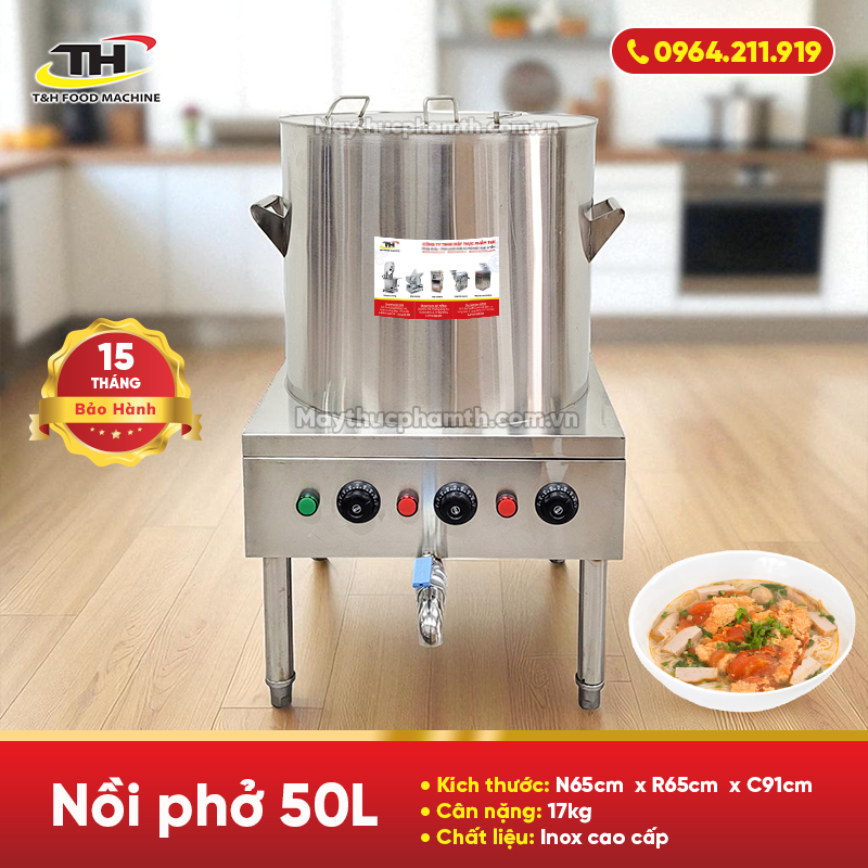 Mỗi tô phở cần một lượng nước dùng khoảng 500ml. Vậy với nồi nấu phở 50L sẽ đáp ứng được khoảng 110 – 120 bát phở mỗi lần, đáp ứng tốt cho các quán bún phở quy mô nhỏ.